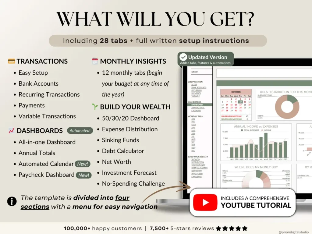 This Ultimate Budget Spreadsheet includes 28 tabs divided in 4 sections:
